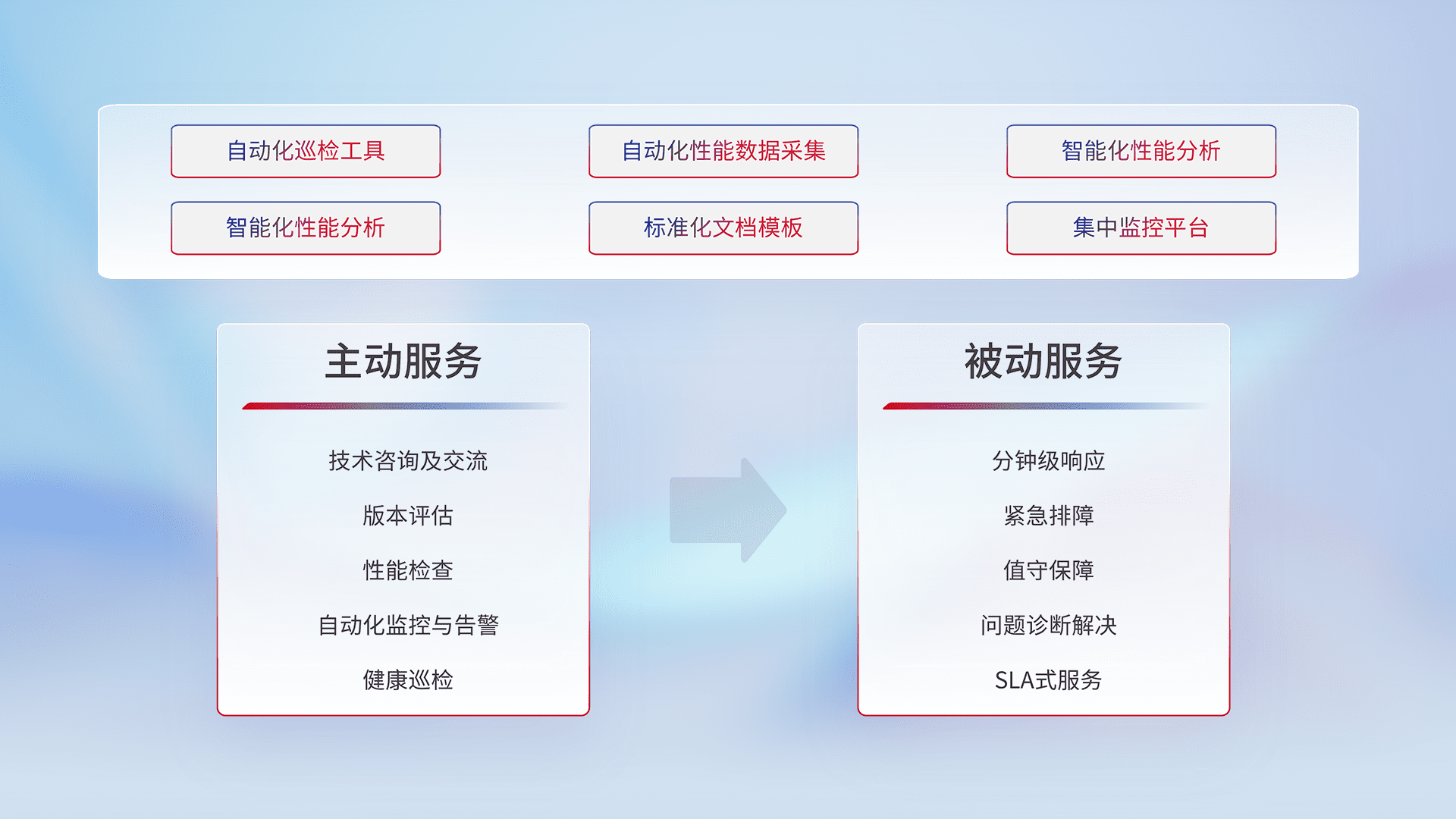 智能化工具和标准化文档,,,,保障服务质量,,提供主动服务(包含技术咨询、、、版本评估、、、性能检查、、、、自动化监控与告警、、健康巡检)和被动服务包含(分钟级响应、、紧急排障、、、、值守保障、、问题诊断解决、、、、SLA服务)。。。。